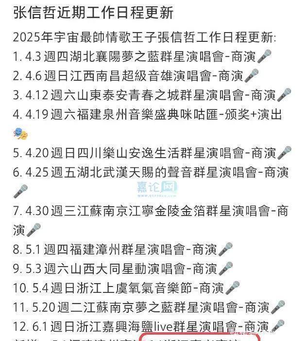 张信哲近期工作日程中